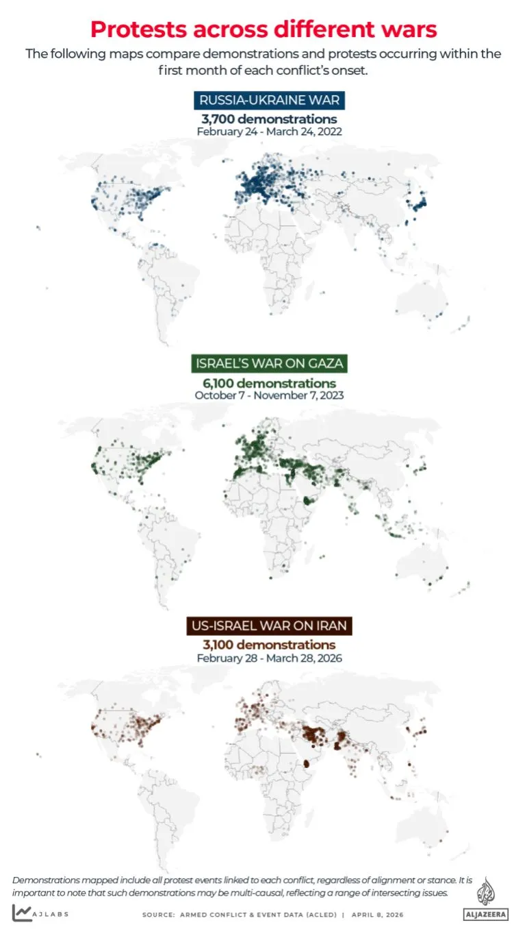 At the height of protests over the war in Gaza, major cities including London, Paris, Washington and Berlin saw demonstrations drawing hundreds of thousands of participants. Similar scenes accompanied early responses to the Russian invasion of Ukraine in 2022.